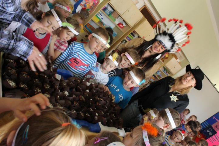 Na zakończenie całego przedstawienia każda grupa przedszkolaków otrzymała czekoladowe babeczki i mogła zrobić sobie pamiątkowe zdjęcie z gośćmi przy kolorowym totemie. Kowboje i Indianie obiecali, że znów odwiedzą dzieci w przedszkolu podczas Rodzinnego Pikniku, który odbędzie się 29 maja o godz. 16:00.