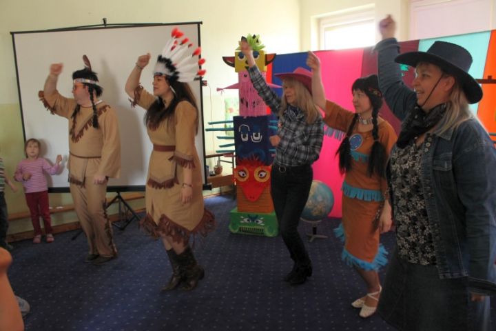 Na początku każda grupa przedszkolaków zaprosiła do siebie jednego gościa, z którym wykonała indiańskie opaski albo kowbojskie odznaki szeryfa. W takich przebraniach wszystkie dzieci zebrały się w głównej sali, gdzie czekali już na nich Indianie i kowboje z niespodziankami. Indianie opowiedzieli o swojej wiosce, strojach, domach, w jakich mieszkają, o środkach transportu, jakimi się poruszają. Przypomnieli dzieciom, że bardzo ważny jest szacunek do osób starszych, opieka nad nimi. Wspomnieli o „zaklinaniu” pogody, czy o życiu w zgodzie z przyrodą. Nowe słowa: tipi, wigwam, bizon czy kanu, nie sprawiały dzieciom trudności.