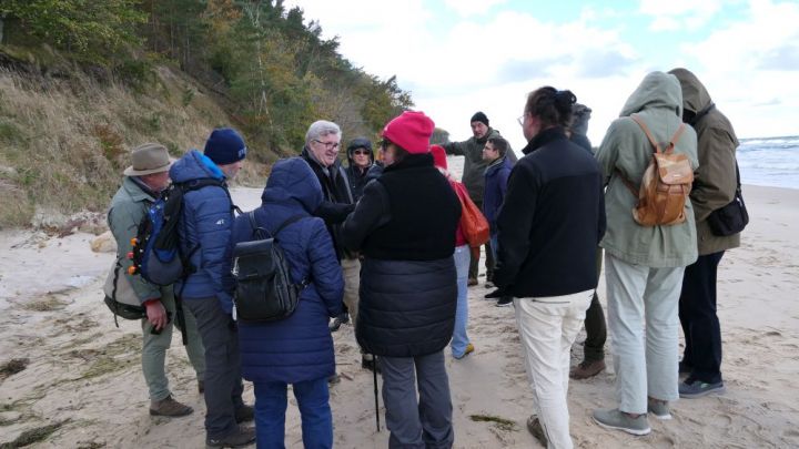 Po wykładzie wszyscy uczestnicy wyruszyli nad malownicze Jezioro Gardno i dalej na plażę w Grodnie przy dyrekcji WPN, gdzie mogli podziwiać imponujące nadmorskie klify i wysłuchać opowiści dr. Piotrowskiego m.in. o ich ukształtowaniu. Spacer zarówno w części wykładowej jak i tej terenowej dostarczył wielu ciekawych informacji o historii geologicznej Wyspy Wolin i procesach, które kształtowały przez epoki i wieki ten niepowtarzalny krajobraz.