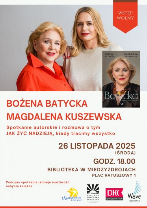 (Międzyzdroje) Miejska Biblioteka Publiczna w Międzyzdrojach zaprasza na spotkanie autorskie z Bożeną Batycką, bizneswoman i projektantką mody, które odbędzie się 26 listopada 2025 r. (środa) o godz. 18.00 w bibliotece (Plac Ratuszowy 1). Moderatorem spotkania będzie międzyzdrojanka - Magdalena Kuszewska, dziennikarka i pisarka, współautorka biografii pt. „Batycka. Gorzki smak sukcesu”. Porozmawiamy o tym jak żyć nadzieją, kiedy tracimy wszystko.