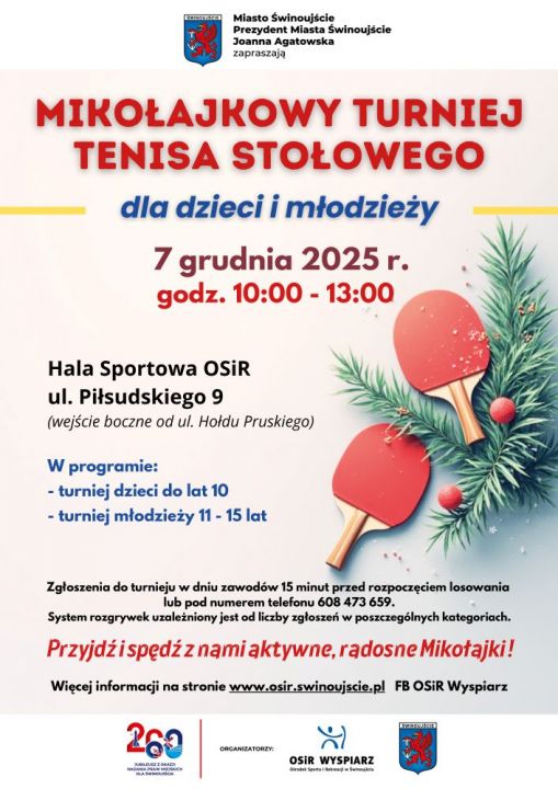 Już w niedzielę, 07 grudnia 2025 r., Ośrodek Sportu i Rekreacji „Wyspiarz” serdecznie zaprasza dzieci i młodzież do udziału w Mikołajkowym Turnieju Tenisa Stołowego, który odbędzie się w Hali Sportowej przy ul. Piłsudskiego 9 w Świnoujściu, w godzinach od 10:00 do 13:00.