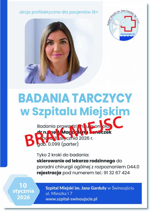 Badania przeznaczone są dla osób od 18. roku życia, a liczba miejsc jest ograniczona, łącznie przebadanych zostanie 100 osób.Aby wziąć udział, potrzebne jest skierowanie do Poradni Chirurgii Ogólnej z rozpoznaniem D44.0.Badania poprowadzi lek. Magdalena Janeczek, chirurg onkologiczny z Zachodniopomorskiego Centrum Onkologii w Szczecinie, na co dzień zajmująca się diagnostyką i leczeniem chorób tarczycy.Szpital zachęca mieszkańców do skorzystania z możliwości wczesnego sprawdzenia stanu zdrowia. Informacje o zapisach można uzyskać w Rejestracji Centralnej Szpitala Miejskiego.