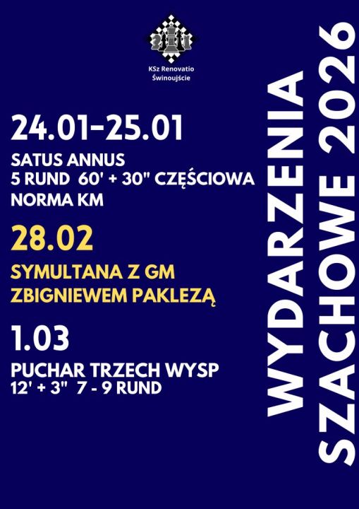 Klub Szachowy Renovatio Świnoujście w dniu 28 lutego br. o godzinie 15.30 organizuje w świnoujskim Dom Kultury „Słowianin” (ul. Matejki 43) symultanę z GM (Arcymistrzem) ZBIGNIEWEM PAKLEZĄ. Zgłoszenia udziału do 20 lutego.