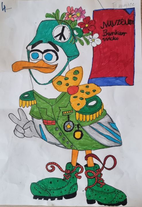 Projekt: „Mewcia Ewcia – militarystka – pacyfistka” – mewa w hełmie z pacyfką i kwiatami, w mundurze i traperach.
