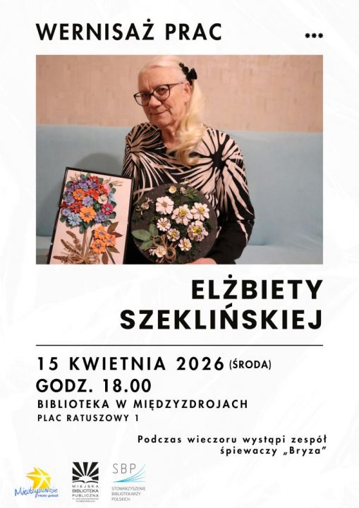 (Międzyzdroje)n Miejska Biblioteka Publiczna w Międzyzdrojach zaprasza 15 kwietnia 2026 r. (środa) o godz. 18.00 do biblioteki (Plac Ratuszowy 1) na wernisaż i wystawę prac autorstwa Elżbiety Szeklińskiej. Jej prace to kompozycje z suszonych kwiatów pochodzących z przydomowego ogródka oraz roślin polnych. Te wyjątkowe bukiety zamknięte w obrazach zachwycają bogactwem kolorów i odcieni, oddając piękno natury. Prace Pani Elżbiety mają charakter wyjątkowych obrazów.