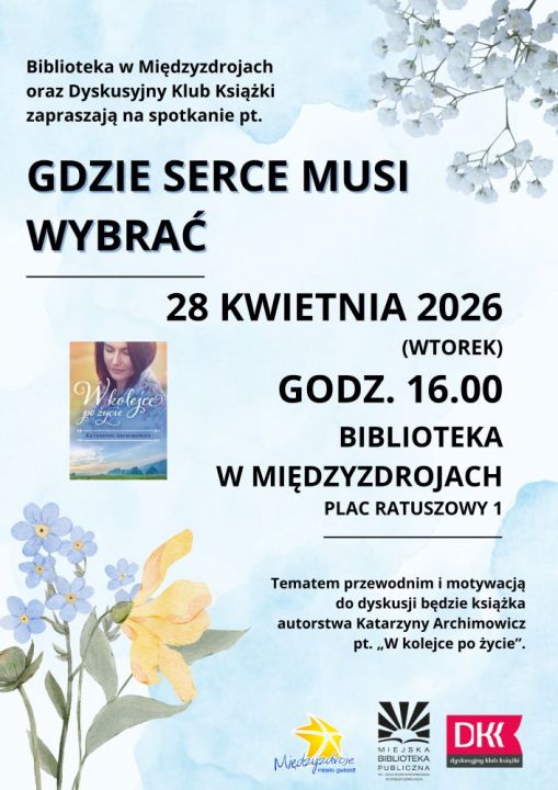 (Międzyzdroje) Miejska Biblioteka Publiczna oraz Dyskusyjny Klub Książki w Międzyzdrojach zapraszają 28 kwietnia 2026 r. (wtorek) o godz. 16.00 do biblioteki na spotkanie pt. „Gdzie serce musi wybrać”. Tematem przewodnim i motywacją do dyskusji będzie książka autorstwa Katarzyny Archimowicz pt. „W kolejce po życie”.