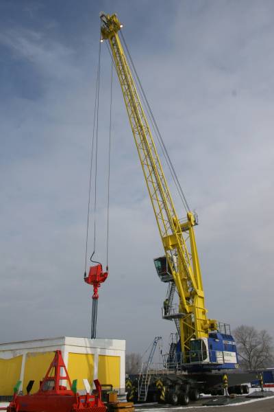 Po zmontowaniu od wtorku 28 lutego br. na poodrowskim terenie Wolnego Obszaru Celnego firma EURO-TERMINAL prowadzi próby z zakupionym w Austrii dźwigiem (na zdjęciu), trwa także szkolenie dla operatorów. Wysoki na 34 metry i długi na 14,9 m dwukabinowy dźwig samojezdny LHM 150 Litronic jest produkcji niemieckiej. Waży 151,2 t, a maksymalny jego wysięg to 32 m. Może udźwignąć na haku maksymalnie 40 ton, a z wysokości 32 m - 15 t. Dźwig jest wyposażony w hak dwurożny (ważący 1,7 t.) oraz automatyczną ramę kontenerową. Jego koła obracają się o 360 stopni dzięki czemu w połączeniu ze stopami poziomuje się i dostosowuje do każdego terenu. Dźwig może się poruszać z prędkością 90 m/minutę, prędkość podnoszenia to 70 m/minutę.