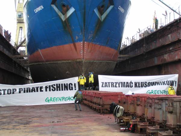 Osiemnastu działaczy Greenpeace blokowało w Morskiej Stoczni Remontowej w Świnoujściu dalekomorski trawler "Carmen" pływający pod banderą gruzińską z rosyjską załogą. Akcja protestacyjna pod hasłem "STOP KŁUSOWNICTWU" rozpoczęła się w środę 16 marca około godziny 7.00. Wtedy to od strony Ognicy do doku stoczniowego ze stojącym tam od 11 marca trawlerem "Carmen" podpłynęły trzy pontony z działaczami Greenpeace z Polski, Austrii i Niemiec. Według nich statek znajdował się na czarnej liście Unii Europejskiej wraz z kilkoma innymi jednostkami ze względu na prowadzenie połowów bez przyznanych kwot połowowych. W ten sposób poprzez nielegalne połowy niszczone są zasoby naturalne, w tym przypadku na akwenie wschodniego Atlantyku.