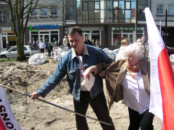 Na wojewódzkie obchody Święta Konstytucji do Świnoujścia przyjechały do naszego miasta VIP-y : wojewoda, marszałek, bp Jan Gałecki, posłowie. Po uroczystej Mszy św. zebrani wraz z pocztami sztandarowymi udali się na Plac Słowiański, gdzie pod pomnikiem Bohaterom walk składano kwiaty. Przy pomniku, po jego prawej stronie obok stelażu z flagami stanęli państwo Bożena i Anatol Tyszkiewiczowie, którzy trzymali transparent z napisem: Prezydent Świnoujścia łamie Konstytucę RP. Zaczęło się składanie kwiatów przez poszczególne poczty. Wtedy do państwa Tyszkiewiczów podszedł komendant Straży Miejskiej, a ci przesunęli się jeszcze bardziej na bok. Kiedy już większość delegacji kwiaty złożyła, a wszyscy zebrani napis dokładnie przeczytali, na placu pojawiło się trzech policjantów po cywilnemu, którzy zaczęli prowadzić z demonstrującymi rozmowę, w końcu wypchnięto ich na ulicę obok policyjnego samochodu. Na zdjeciu Bożena Tyszkiewicz szarpana przez poiicjanta po cywilnemu