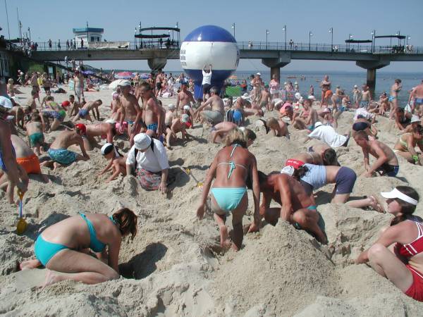 Zaroiło się na plaży od wakacyjnych atrakcji. W ubiegłą środę (5 bm.) w Międzyzdrojach pażowicze bawili się z Polskim Radiem Szczecin w poszukiwaczy skarbów. Radiowcy o świcie w piasku na różnych głębokościach ukryli kilkadziesiąt butelek z informacją w środku o wykopanej nagrodzie. Na hasło "START!" ciągu zaledwie kilku minut pustynny, monotonny krajobraz plaży przy molo zamienił się w teren bardzo zróżnicowany: od wysokich wzgórz po dość głębokie doliny.
