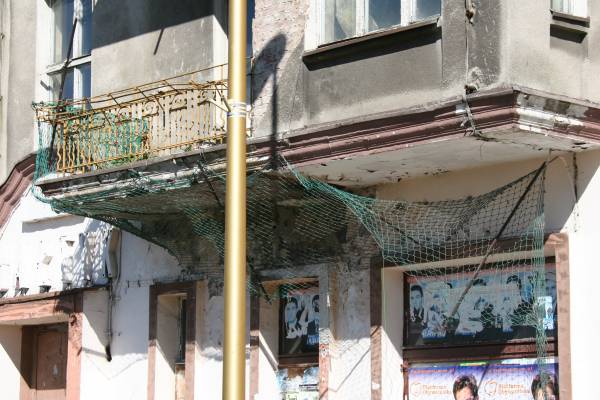 Pisaliśmy już na łamach naszego tygodnika o niebezpieczeństwie, jakie czyha na przechodniów mijających budynek dawnego hotelu „Bałtyk” przy ul. Armii Krajowej. Otóż jakiś czas temu oderwała się tam siatka, której zadaniem była ochrona przechodniów przed odrywającym się tynkiem ze zmurszałych balkonów. Metalowe pręty podtrzymujące siatkę przerdzewiały i teraz one stwarzają zagrożenie. Jeden z nich dawno temu oderwał się od ściany i zwisa tuż nad głowami przechodniów na wysokości ok. 2-2,5 m.