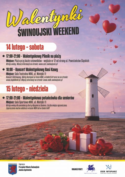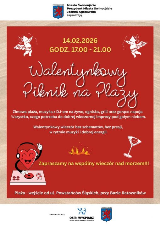 Ośrodek Sportu i Rekreacji „Wyspiarz” zaprasza mieszkańców oraz gości na Walentynkowy Piknik na Plaży, który odbędzie się 14 lutego 2026 roku w godzinach 17.00-21.00 w Świnoujściu (wejście od ul. Powstańców Śląskich, przy Bazie Ratowników).