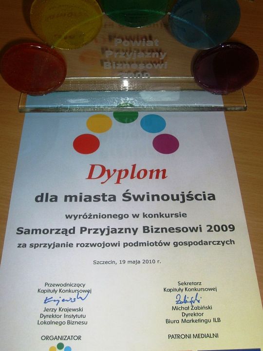 Wczoraj, podczas odbywającej się w Szczecinie Konferencji Lokalnego Biznesu, Zastępca Prezydenta Świnoujścia Ryszard Leon Kowalski odebrał z rąk Olgierda Geblewicza Przewodniczącego Sejmiku Województwa Zachodniopomorskiego, szklaną statuetkę "Tęcza Monet" oraz dyplom i tytuł laureata konkursu "Samorząd Przyjazny Biznesowi 2009".