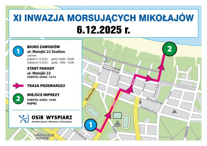 Ośrodek Sportu i Rekreacji „Wyspiarz” uprzejmie informuje, że w związku z organizacją wydarzenia pn. XI Inwazja Morsujących Mikołajów, w dniu 06 grudnia 2025 r. w godzinach od 13:05 do 13:45 wystąpią czasowe utrudnienia w ruchu drogowym.