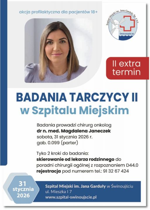 Badania przeznaczone są dla osób od 18. roku życia, a liczba miejsc jest ograniczona, łącznie przebadanych zostanie 100 osób.Aby wziąć udział, potrzebne jest skierowanie do Poradni Chirurgii Ogólnej z rozpoznaniem D44.0.Badania poprowadzi lek. Magdalena Janeczek, chirurg onkologiczny z Zachodniopomorskiego Centrum Onkologii w Szczecinie, na co dzień zajmująca się diagnostyką i leczeniem chorób tarczycy.Szpital zachęca mieszkańców do skorzystania z możliwości wczesnego sprawdzenia stanu zdrowia. Informacje o zapisach można uzyskać w Rejestracji Centralnej Szpitala Miejskiego.