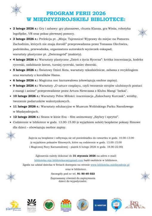 Miejska Biblioteka Publiczna w Świnoujściu zaprasza dzieci i młodzież w okresie ferii zimowych (2-15.02) do uczestnictwa w przygotowanych imprezach i zajęciach. Szczegóły w załączonym plakacie.