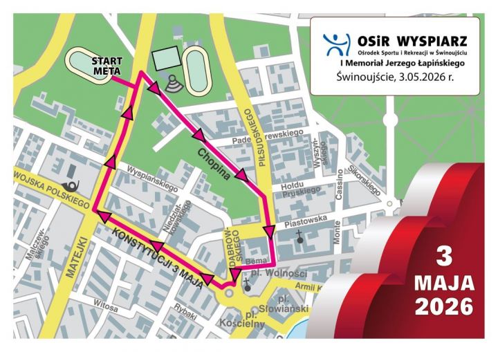 Ośrodek Sportu i Rekreacji „Wyspiarz” serdecznie zapraszamy mieszkańców i gości Świnoujścia na Bieg Konstytucji 3 Maja. To doskonała okazja do aktywnego spędzenia czasu, uczczenie ważnego święta narodowego w sportowej rywalizacji. Bieg odbędzie się w dniu 3 maja 2026 r., o godzinie 12.00 uroczyste otwarcie na Stadionie Miejskim przy ul. Matejki 22.