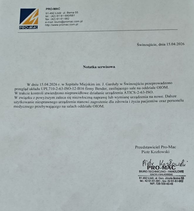 - Nie mamy wyjścia - mówi Wojciech Włodarski, prezes Szpitala Miejskiego im. Jana Garduły w Świnoujściu. - Firma serwisowa przekazała nam w formie pisemnej rekomendację, do której jesteśmy obowiązani się dostosować. Problem polega na tym, że tego rodzaju urządzenie nie jest dostępne "od ręki". Trzeba je wyprodukować - podkreśla Włodarski.