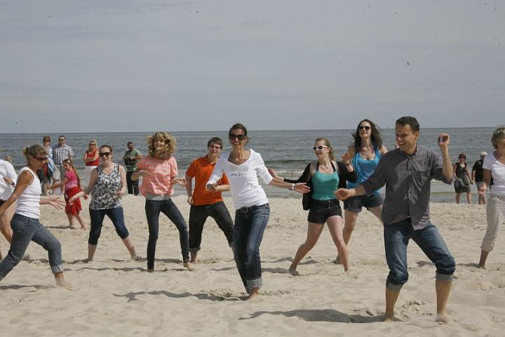 Dzięki Uznamskim Termom Bałtyckim dzisiaj na niemieckiej plaży odbył się pokaz i nauka flash-mob Zumby. Tańce trwały przy wieży ratunkowej nr 3 po lewej stronie od mola w Ahlbecku.