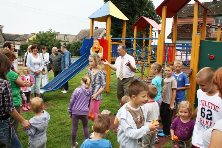 (Wolin) Po poniedziałkowej (06.08.br.) porannej ulewie, w samo południe, już w blasku słonecznych promieni burmistrz Wolina w asyście radnych i pracowników Urzędu Miejskiego przekazał do użytku długo oczekiwany placu zabaw najmłodszym. Kolorowe urządzenia: huśtawka, bujaki na sprężynie, karuzela, gra kółko - krzyżyk, zestaw wielofunkcyjny ze zjeżdżalnią i ściankami wspinaczkowymi oraz zjazd linowy, przyciągają uwagę i zapraszają do zabawy. Dodajmy, że niedawno oddano do użytku plac ćwiczeń dla dorosłych na terenie przy „orliku”. Koszt całkowity budowy placu zabaw to 100 tys. zł. Foto: UM