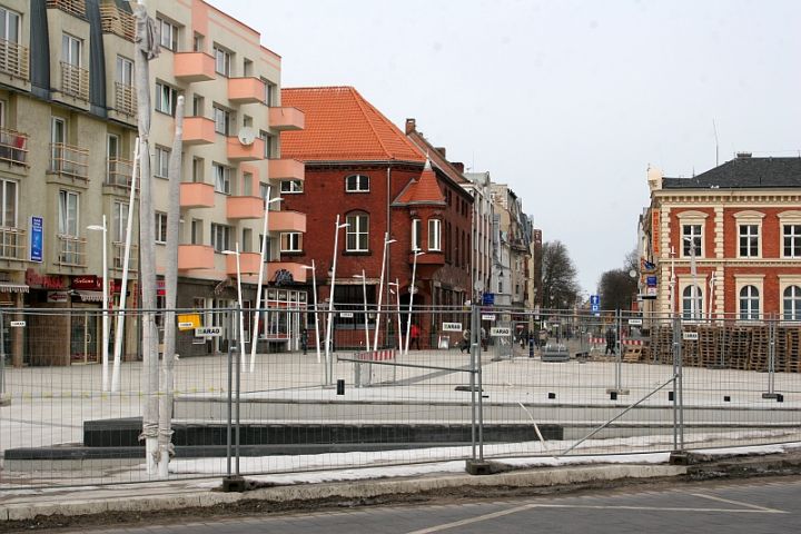 W wyżej wspomnianym grudniowym numerze tygodnika napisaliśmy między innymi: (...)Po przebudowie, co już częściowo widać, ruch samochodowy odbywać się będzie tylko po stronie południowej placu. Na odcinku pomiędzy rondem, a ul. Armii Krajowej projektanci zaproponowali umieszczenie przystanku komunikacji miejskiej. Pozostały teren placu będzie stanowił, zagospodarowaną, otwartą przestrzeń, podzieloną na dwie części. Zgodnie z projektem w tzw. przestrzeni miejskiej po stronie zachodniej placu będą mogły odbywać się np. koncerty, czy większe publiczne spotkania. Druga część przeznaczona będzie na relaks. Zaprojektowano też fontannę zbudowaną na przepuszczalnym podłożu i płytki ciek wodny. Projekt konkursowy zakładał też wybudowanie tzw. plaży miejskiej, gdzie dzieci mogłyby chłodzić się w fontannie, a dorośli wypoczywać na ławeczkach i kamiennych leżakach. Zimą planowano też zorganizowanie na placu miejskiego lodowiska. Na placu mają pojawić się enklawy zieleni. Całość ma być podświetlona reflektorami umieszczonymi w posadzce. Będzie też miejsce na stojaki rowerowe i Internet bezprzewodowy. Obie przestrzenie rozdzielać ma główny ciąg pieszy łączący ul. Piłsudskiego z pl. Słowiańskim. Tak było w pierwotnym projekcie. Sytuacja jednak nieco się zmieniła. Wszystko za przyczyną przetargów i w związku z brakiem pieniędzy.(...)